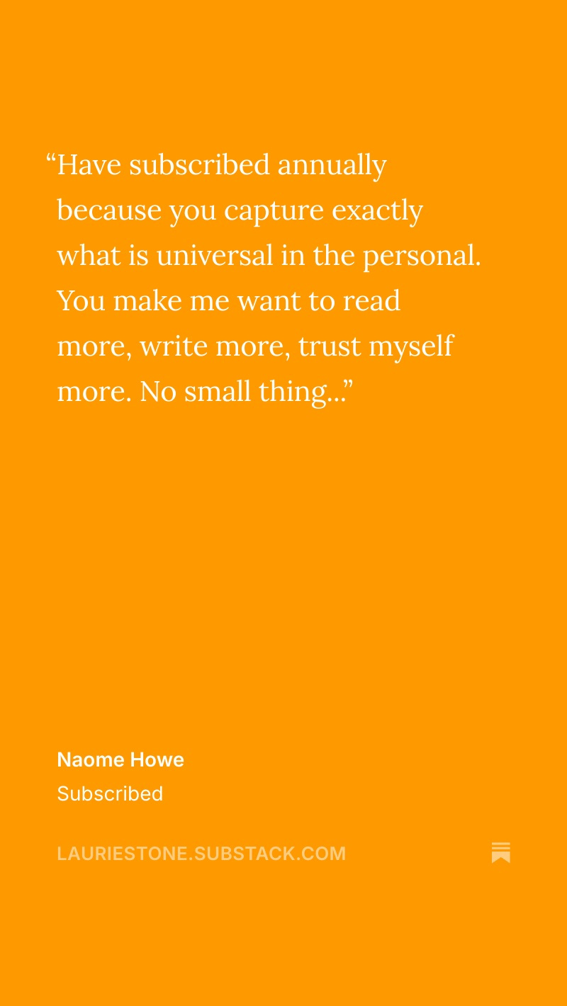 If you would like to book time to talk one-on-one about STARTING AND GROWING a Substack publication please email me at: lauriestone@substack.com. I can help you through the software, choosing a title, art design, and approaches to gaining readers.